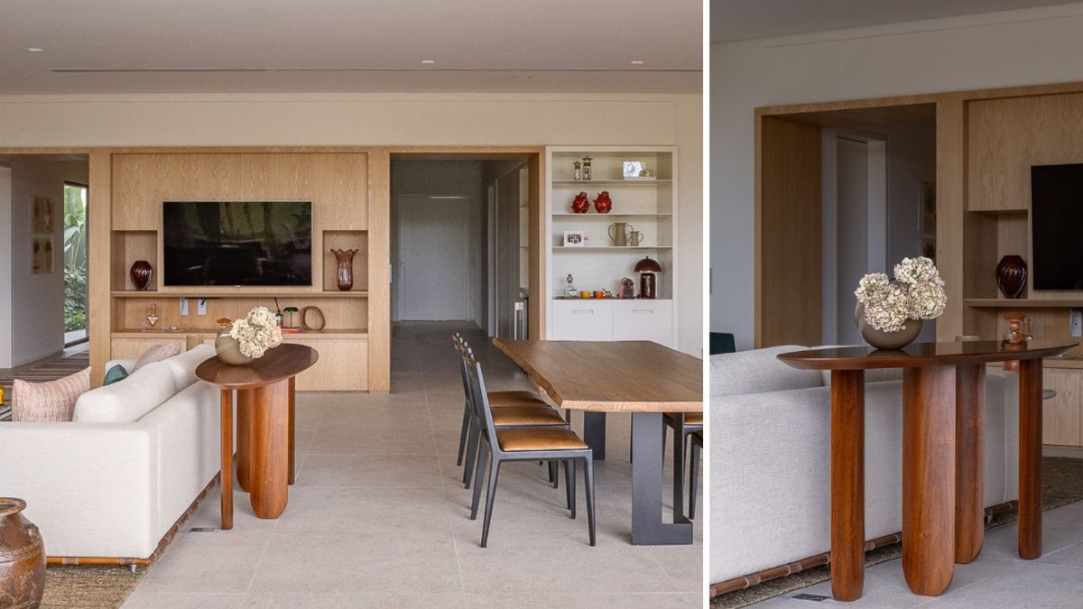 O aparador de formas orgânicas tanto preserva a parte detrás do sofá, como oferta apoio em ocasiões oportunas -Projeto: Paiva e Passarini Arquitetura e Design | Fotos: Vitor Martins