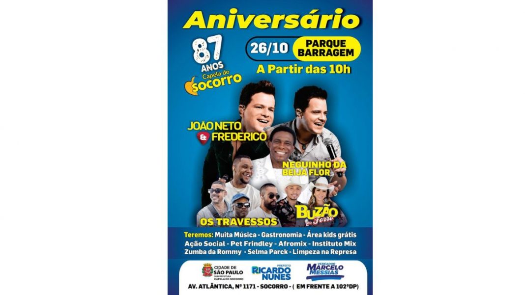 As celebrações do aniversário de 87 anos acontecerão no dia 26 de outubro, domingo, no Parque Barragem (Avenida Atlântica, nº 1171, em frente à 102ª DP), a partir das 10h. A programação inclui shows de João Neto e Frederico, Neguinho da Beija-Flor, Os Travessos e Buzão do Forró. O público poderá aproveitar ainda gastronomia, área kids gratuita, ações sociais, espaço pet friendly, Afromix, Instituto Mix, Zumba da Rommy, Selma Park e a ONG Limpeza da Represa, promovendo integração entre cultura, lazer e conscientização ambiental.