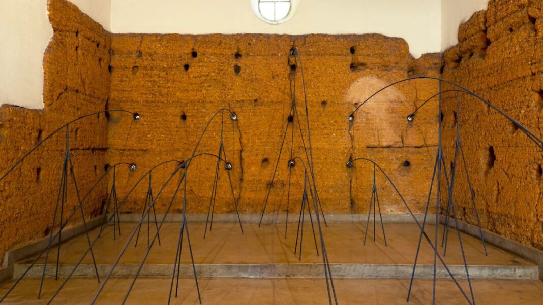 Obra é construída a partir dos furos originais da taipa de pilão e traz reflexão sobre equilíbrio, corpo e espaço