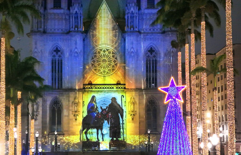 A programação inclui até o dia 6 de janeiro projeções mapeadas em prédios históricos — Catedral da Sé, Correios, Theatro Municipal, Pateo do Collegio e sede da Prefeitura — com nove sessões diárias entre 19h20 e 21h40. O Largo São Bento abriga uma vila temática com pista de patinação no gelo, árvore gigante e presépio, funcionando das 14h às 23h, enquanto a Praça da Sé recebe o espaço Brincar no Natal, com brinquedos infláveis, Casa do Papai Noel e atividades diárias das 11h às 20h.