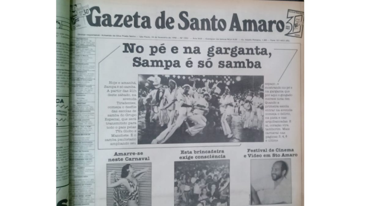 O fragmento abaixo traz a manchete “No pé e na garganta, Sampa é só samba”, que foi capa da publicação de 24 de fevereiro de 1990 e que falava do desfile das escolas de samba quando ainda ocorria na Avenida Tiradentes. Abaixo, leia trecho da matéria.