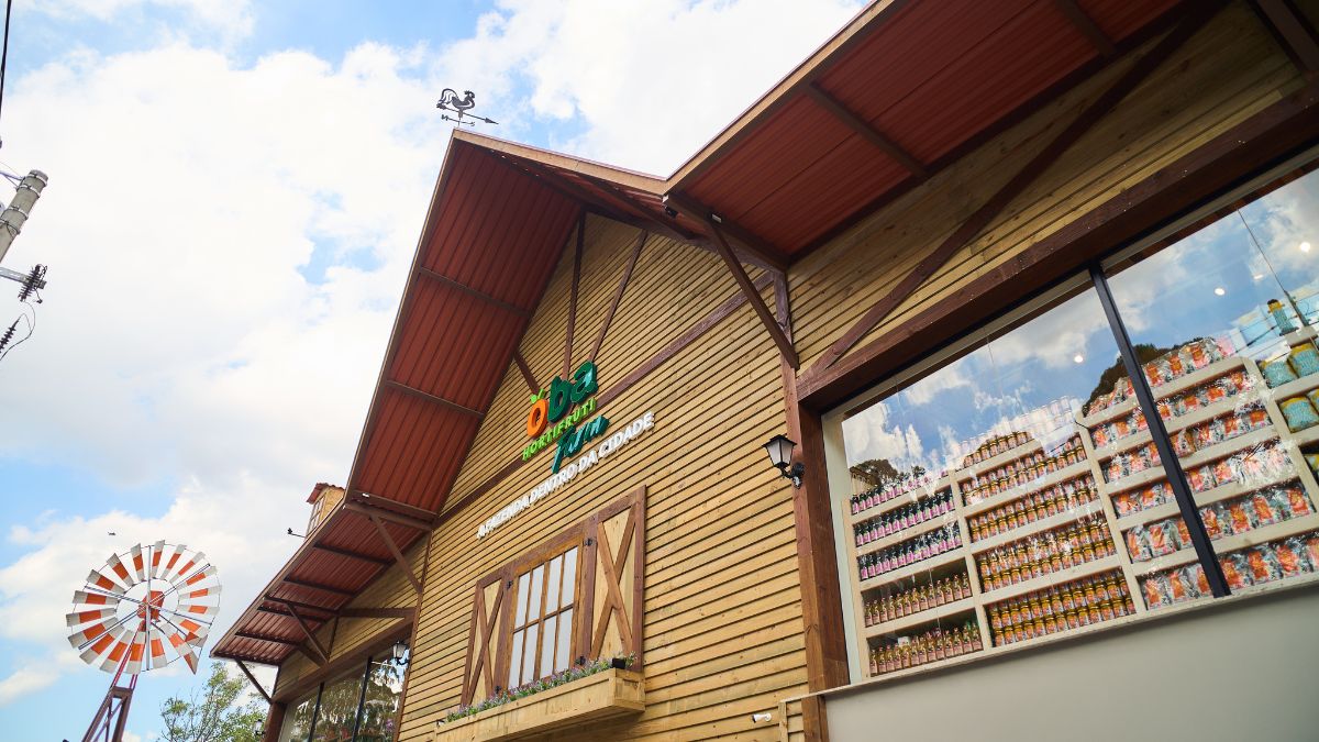 O ambiente segue o padrão visual característico do conceito Oba Farm, com estrutura de madeira rústica, iluminação acolhedora e decoração inspirada no campo, criando uma experiência de compra leve e prazerosa.