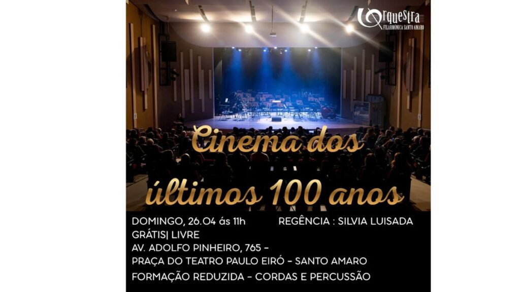 No domingo, 26 de abril, às 11h, a Ofisa (Orquestra Filarmônica Santo Amaro) irá realizar um concerto especial na Praça do Teatro Paulo Eiró, localizada na Av. Adolfo Pinheiro, 765. A apresentação celebra os últimos 100 anos das trilhas sonoras do cinema e contará com formação reduzida da filarmônica, com apenas cordas e percussão. Também haverá apresentação de bailarinos, que prometem uma bela surpresa ao público presente.