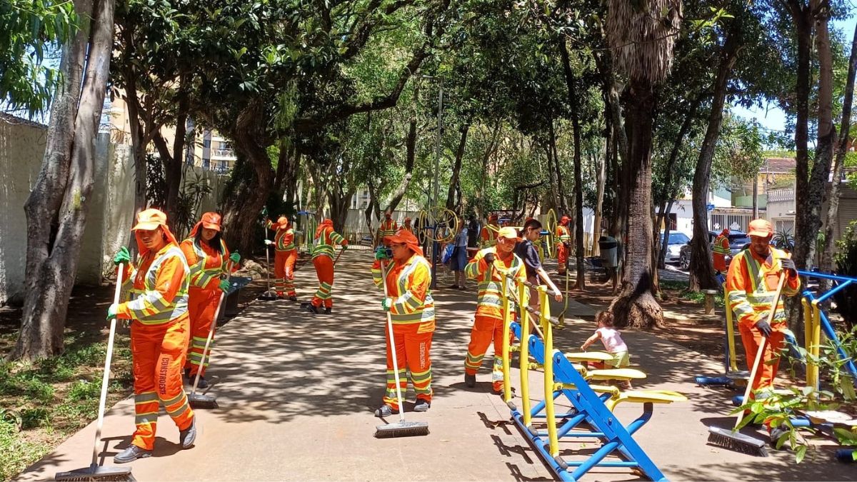 Equipes trabalhando na limpeza da praça